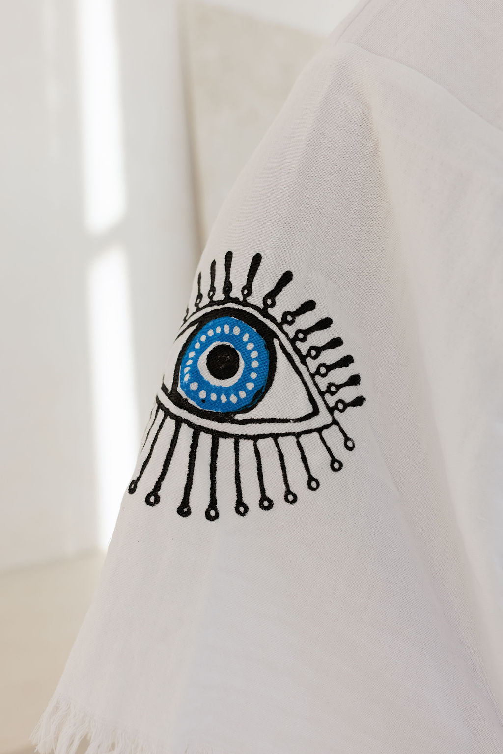 Crafted in crisp white and finished with our signature sun-face print, it sits at a flattering 100cm length for a relaxed, easy fit.