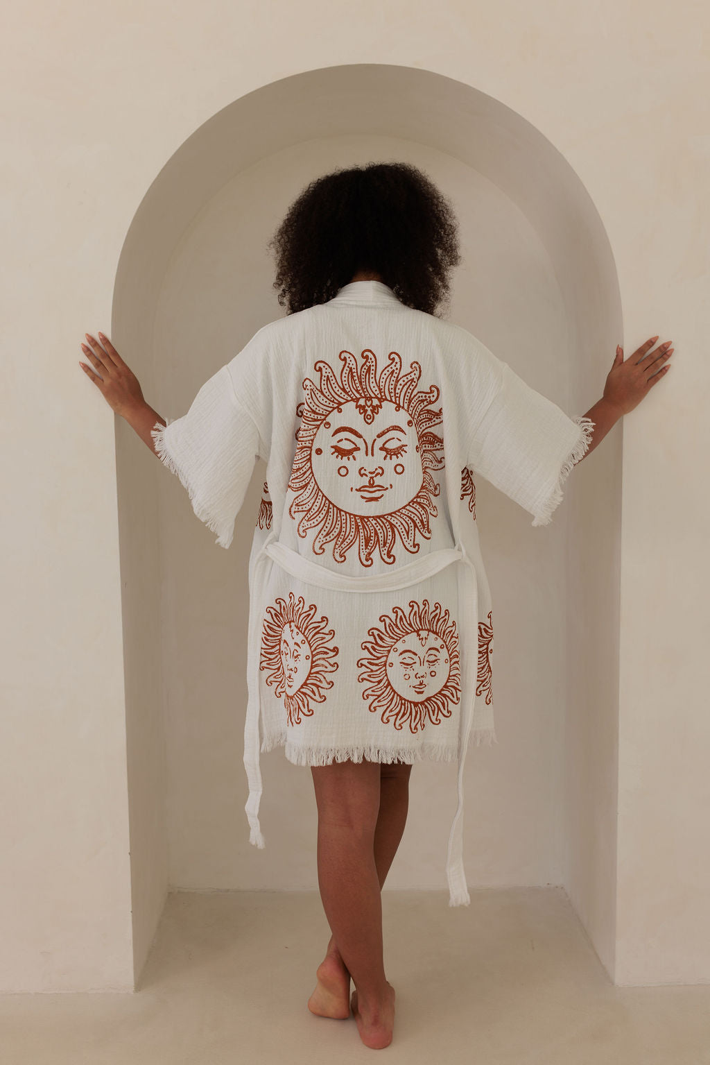 A beautiful white robe measuring 100 cm in length, designed in our signature mini style. Finished with a striking sun-face print, this robe brings a touch of warmth and personality to your everyday lounging. Lightweight, soft, and effortlessly stylish- the perfect blend of comfort and statement design.