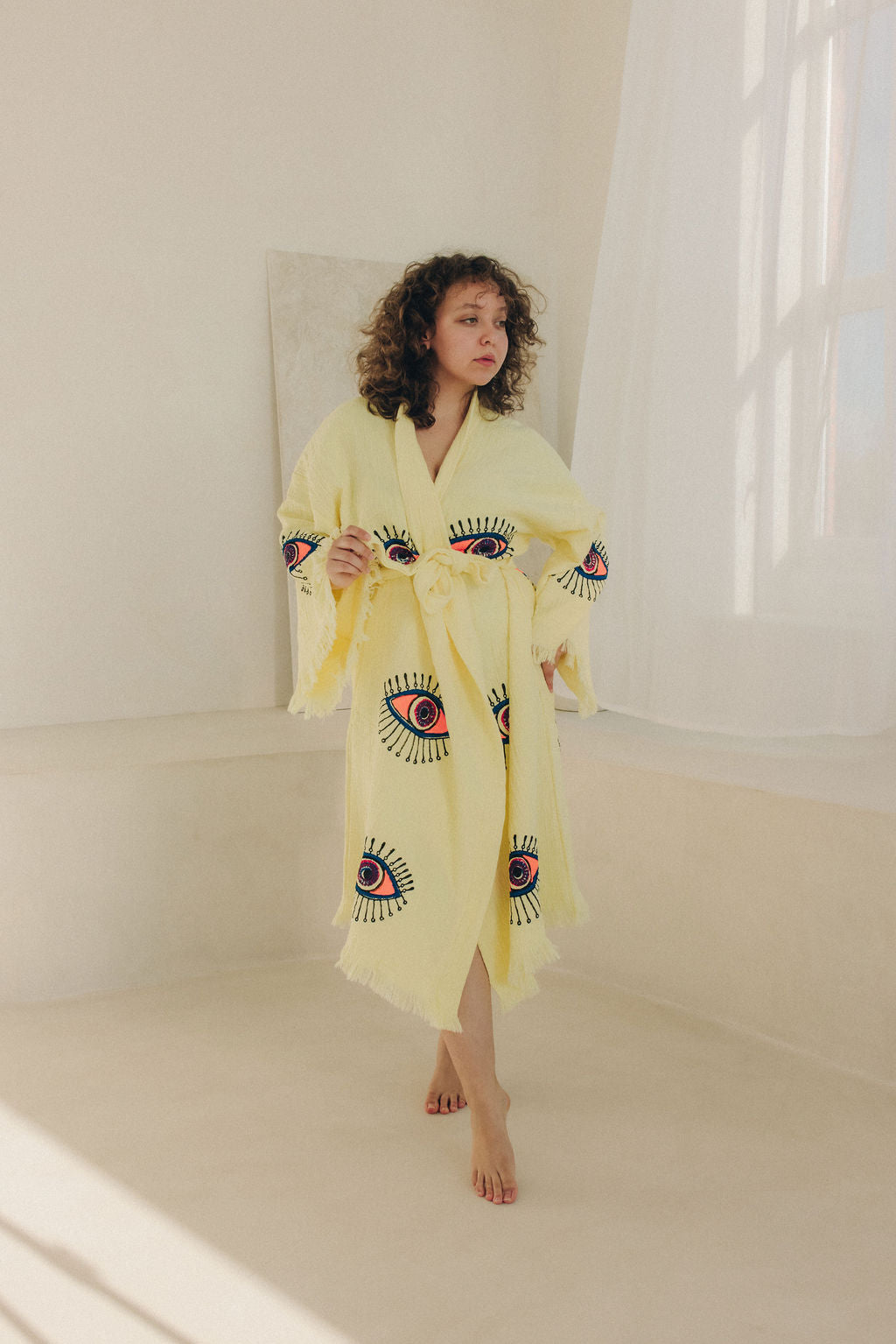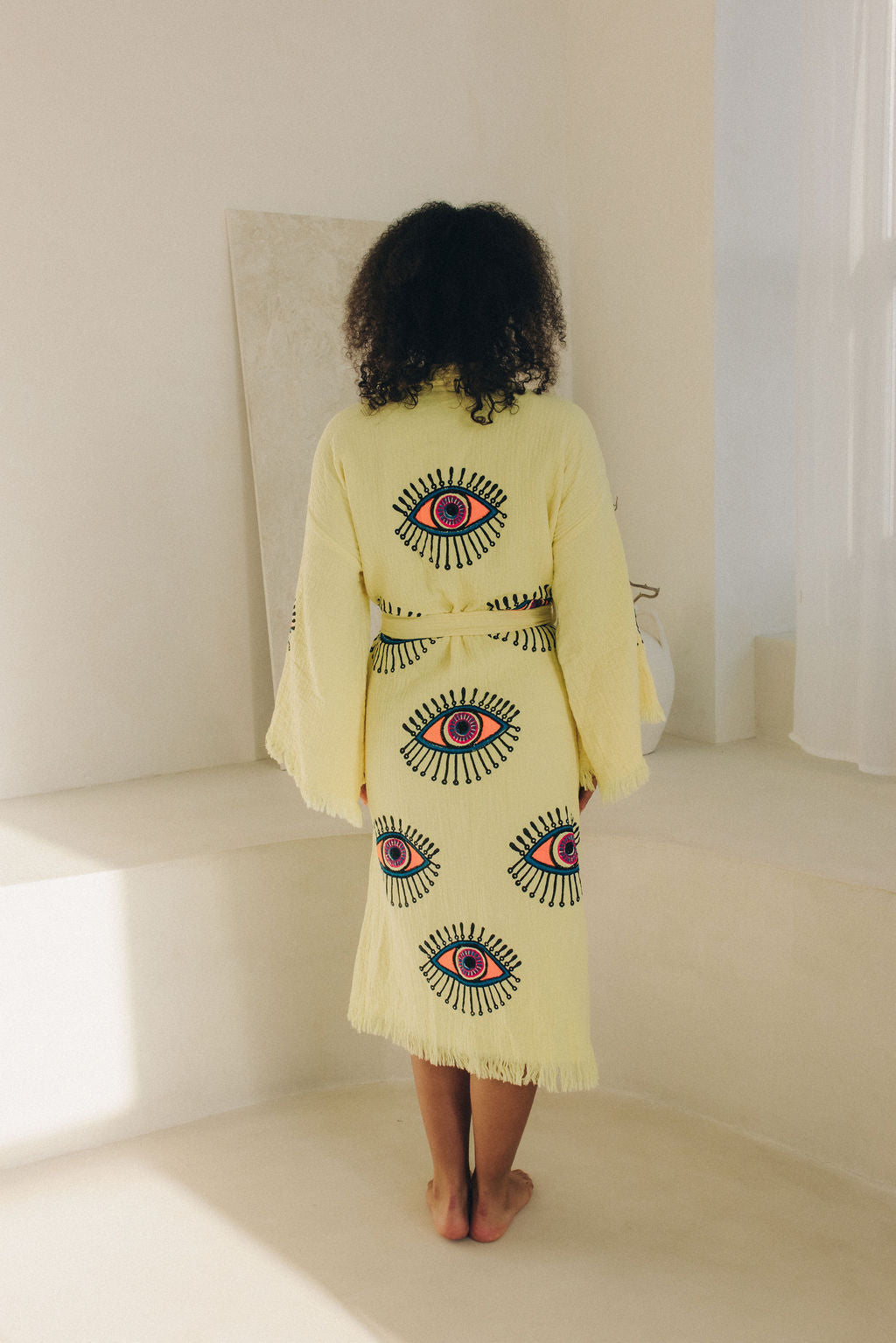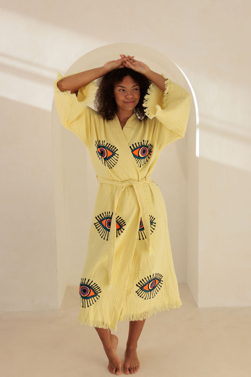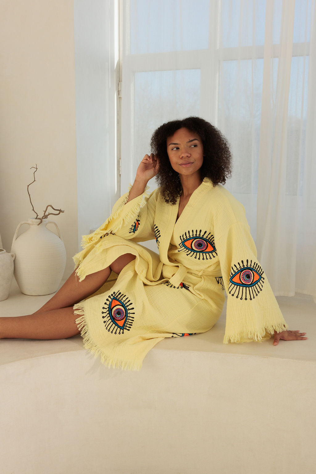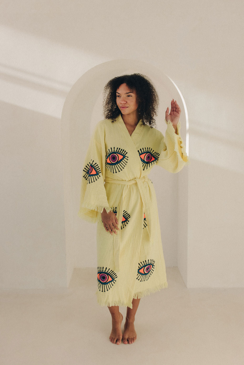 Zoya robe brings bold energy and effortless charm. With its vibrant evil eye design and eye-catching colour palette, Zoya is a statement piece with a story — a symbol of protection wrapped in soft, breathable cotton.